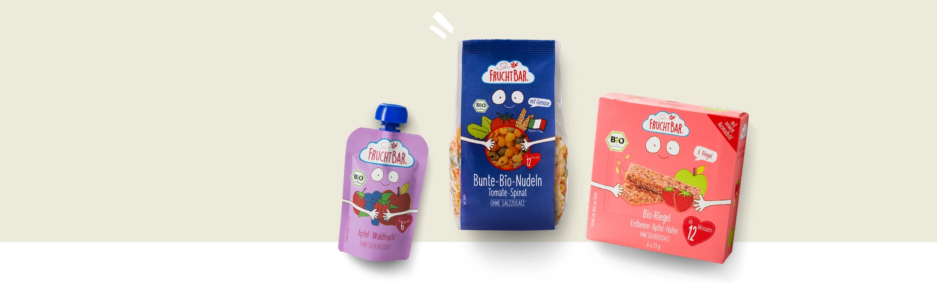 Ob Quetschies mit Gemüse und Fruchtquetschies, die kleine Kinder selbst portionieren können, oder handliche Snacks und Riegel für unterwegs: Unsere praktisch verpackten FruchtBar-Produkte sind immer schnell zur Hand, wenn es mal wieder turbulent zugeht. Dabei verstehen wir unsere Produkte nicht als Ersatz für eine ausgewogene Ernährung – sondern als liebevolle Ergänzung, die euch spontane Momente, kleine Genussauszeiten und mehr gemeinsame Zeit schenkt.